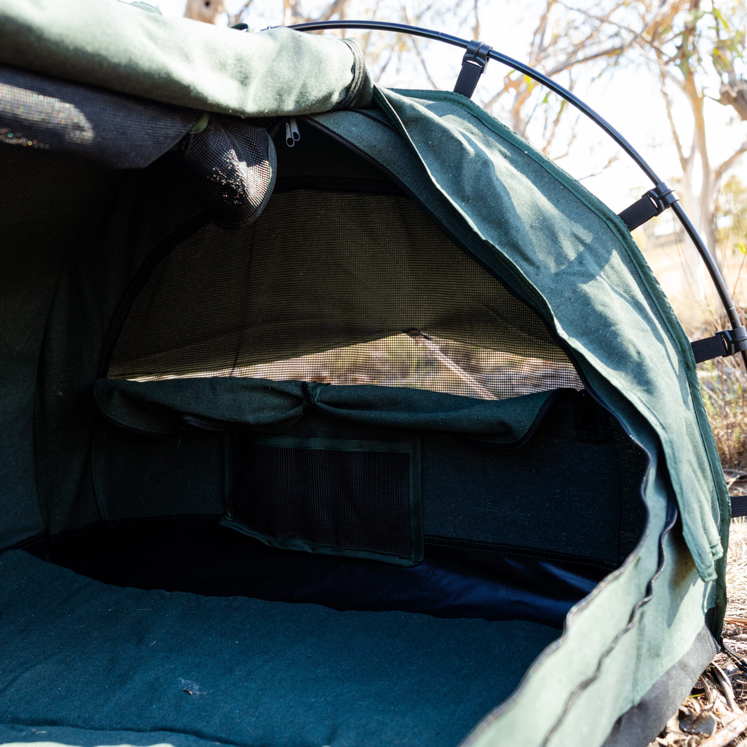After 12 months of design, testing and refinement, the Brumby Swag has been built to put durability first, comfort second, and gimmicks last. This is a standalone dog swag that doesn’t rely on you, your swag, or your tent to keep your dog dry and comfortable.